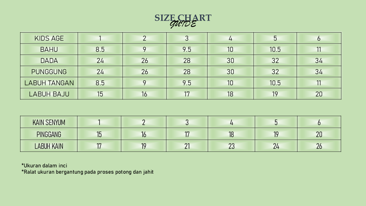 * SIZE : 1 Tahun sehingga 6 Tahun